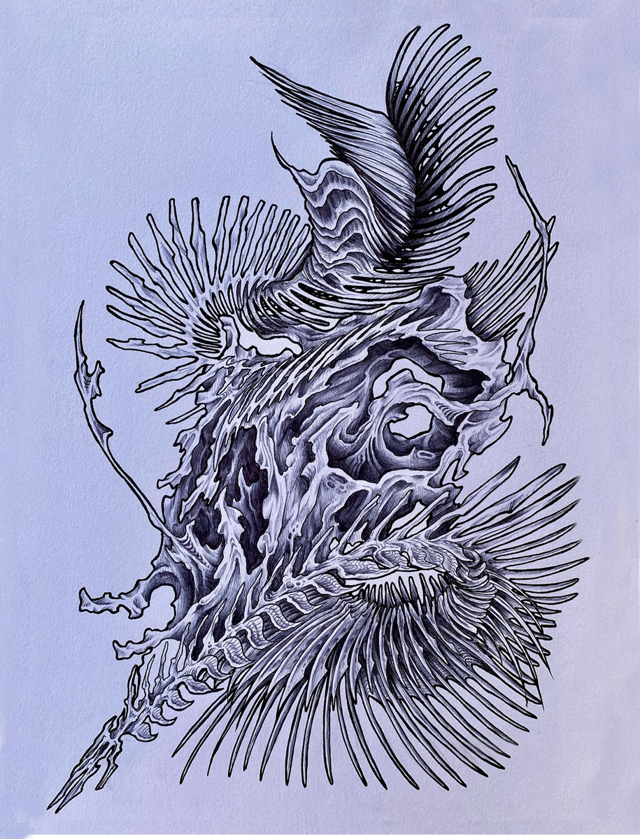 «Nelle mie opere esploro l’interiorità psicologica e i cambiamenti nella percezione della realtà , indagando come relazioni ed esperienze esterne influenzino il nostro mondo interiore. Utilizzo elementi fisici che richiamano l’essenza della nostra interiorità , come ossa e viscere, simboli spesso associati alla morte, ma che rappresentano al contempo la fondamentale vitalità di un organismo».